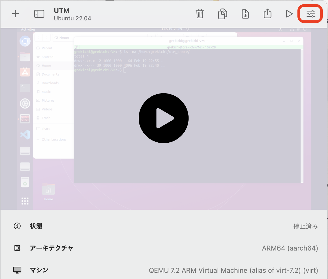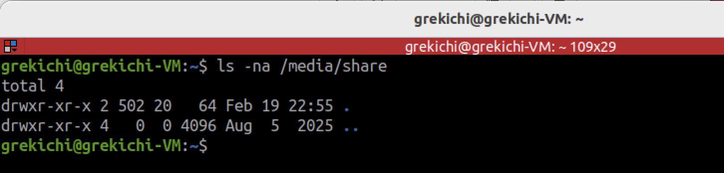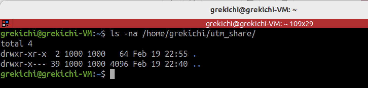 ls -na /home/grekichi/utm_share私の環境では、実行結果は以下の通りです。