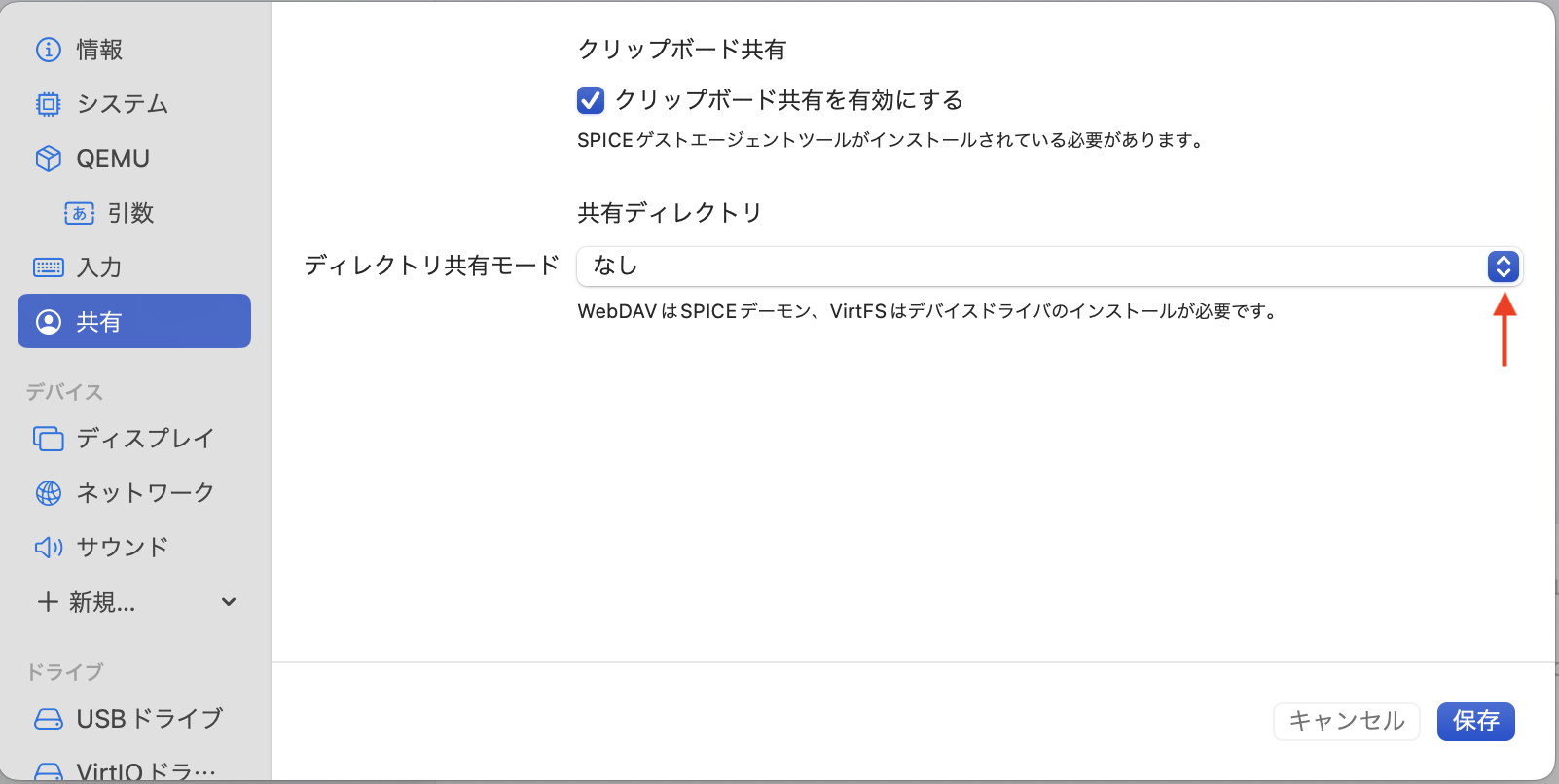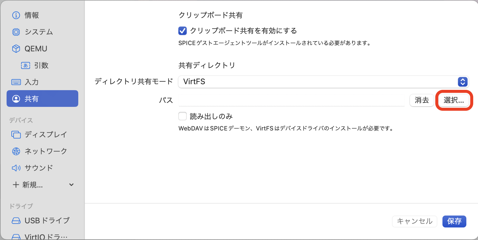 プルダウンには、“SPICE WebDAV”と“VirtFS”のいずれかが選べますが、今回は“VirtFS”を選択します。理由は、“SPICE WebDAV”での設定は、私が何度か試してもうまくいかなかったからです💦