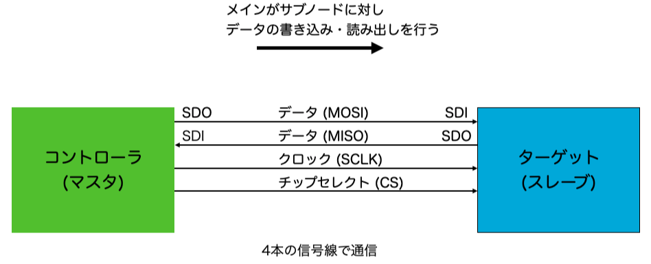 通信を行うのにマスター(親機)とスレーブ(子機)の間で4本の信号線(SCLK、MOSI、 MISO、CS)を使います(※派生仕様で3線式もあるが、基本はあくまで4線式)。