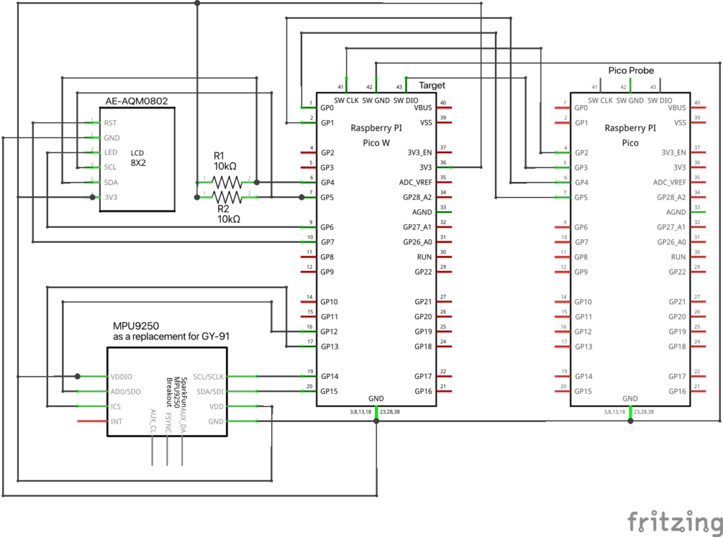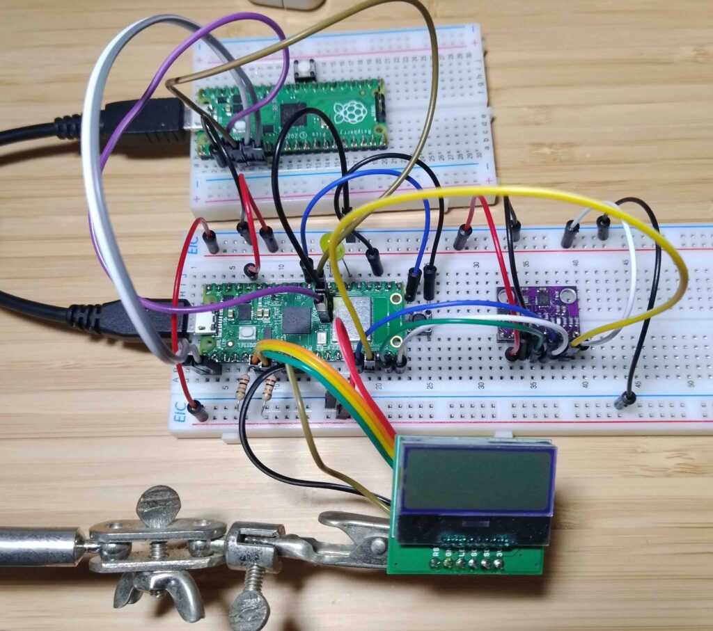 そして最後に、計測結果はPC上に表示するなら何故LCDを繋いでいるのか?ですが、センサーできちんと計測できているか、簡易的に加速度の結果のみを即座に確認できるようにしかったからで、デバッグ用途のために使いました。そのLCDはI2C通信用のプルアップ抵抗を外付けしてます。(これは前回までの教訓の一つです😁)